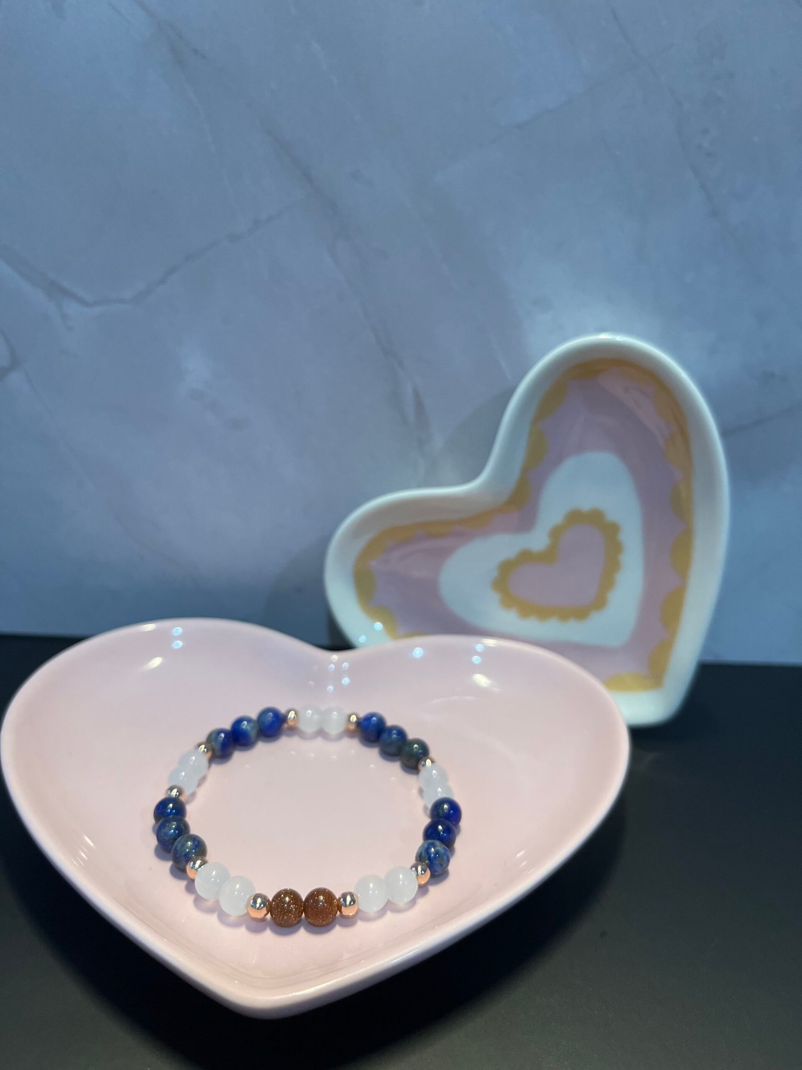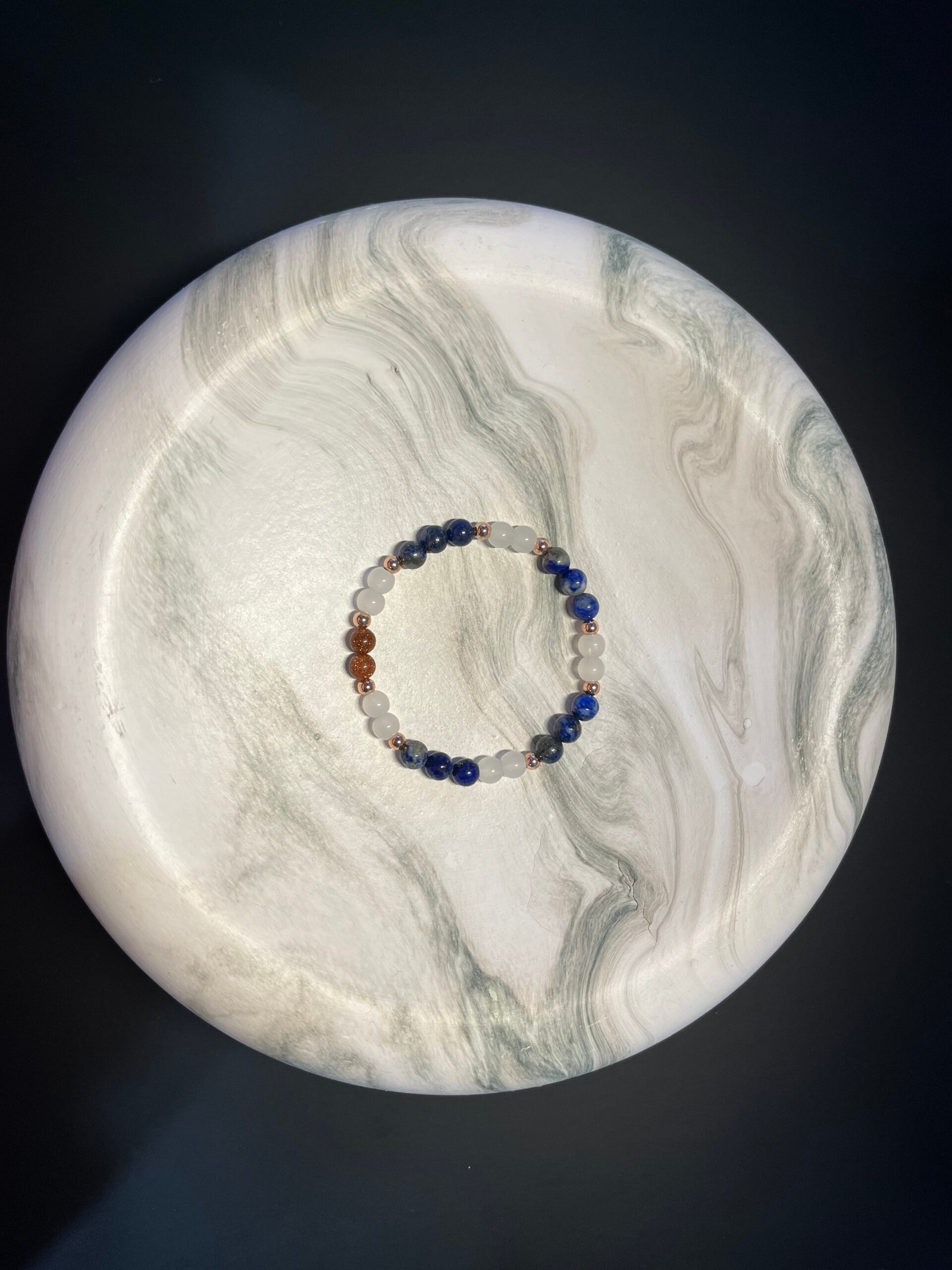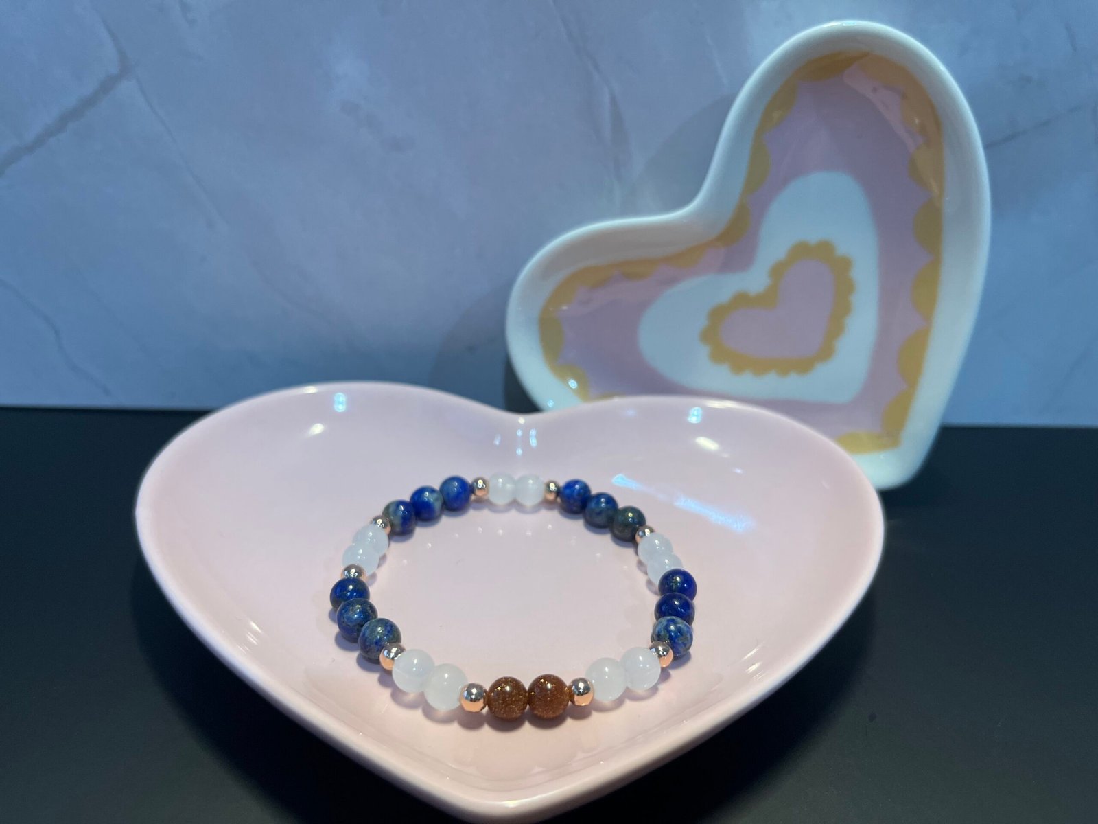 The Karen Bracelet embodies a unique blend of sentimentality and elegance. Thoughtfully handmade using carefully selected materials, this exquisite piece is more than just an accessory; it’s a celebration of meaningful relationships and personal milestones. Highlighting Lapis Lazuli, known as the stone of friendship, the bracelet carries the essence of genuine bonds and cherished connections in its vibrant blue tones. What truly sets the Karen Bracelet apart is its intricate design and thoughtful material choices. Golden Sand Stone, recognized as the stone of wisdom, adds its warm golden shimmer, symbolizing clarity and intellect. Complementing this is the milky white glass beads, which impart a sense of purity and serenity to the overall design. To complete the look, rose gold accents bring an inviting finish that balances modern aesthetics with timeless charm, ensuring it becomes a standout addition to your jewellery collection.
