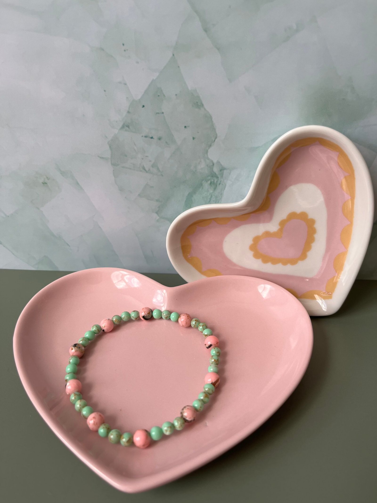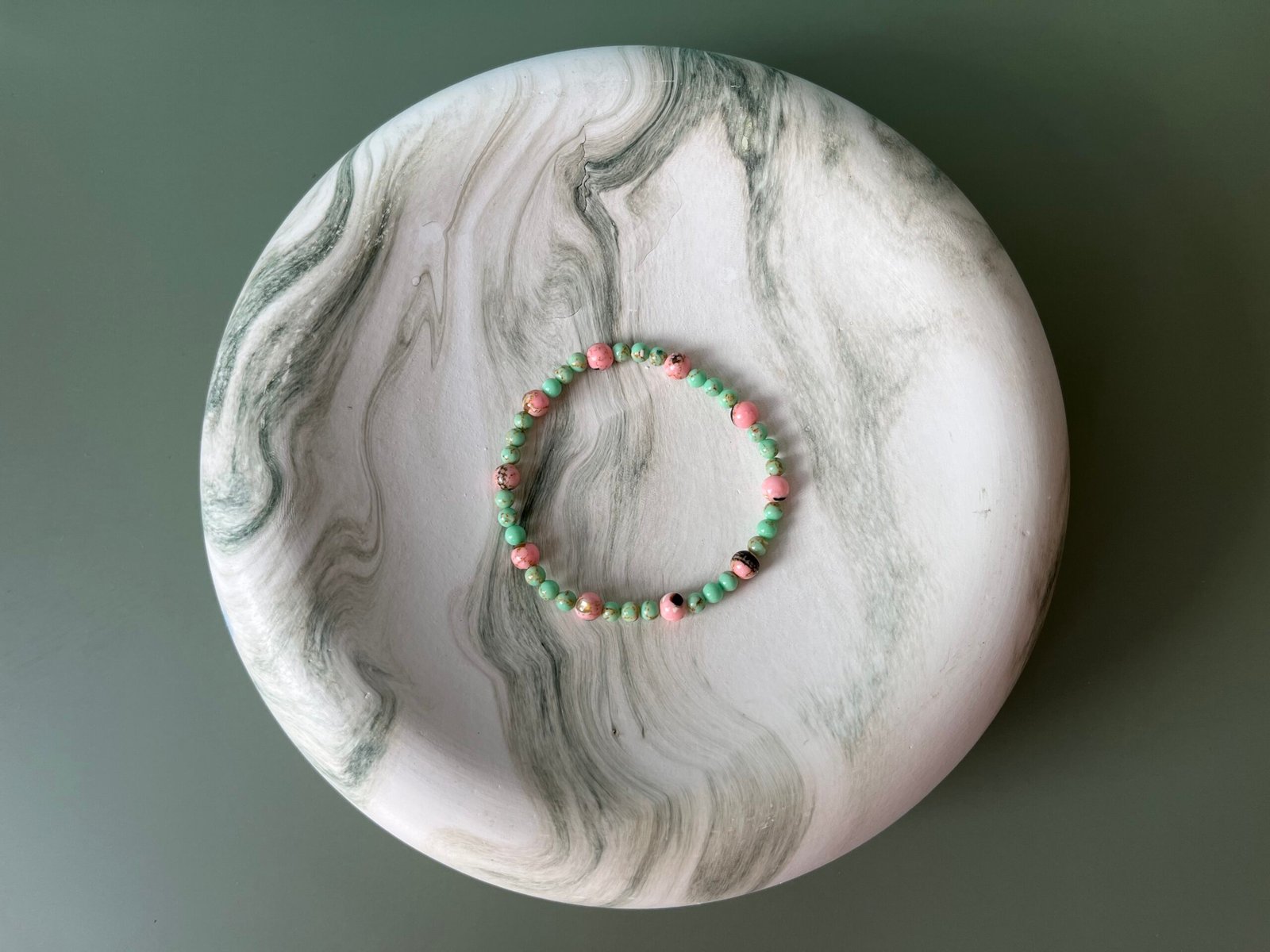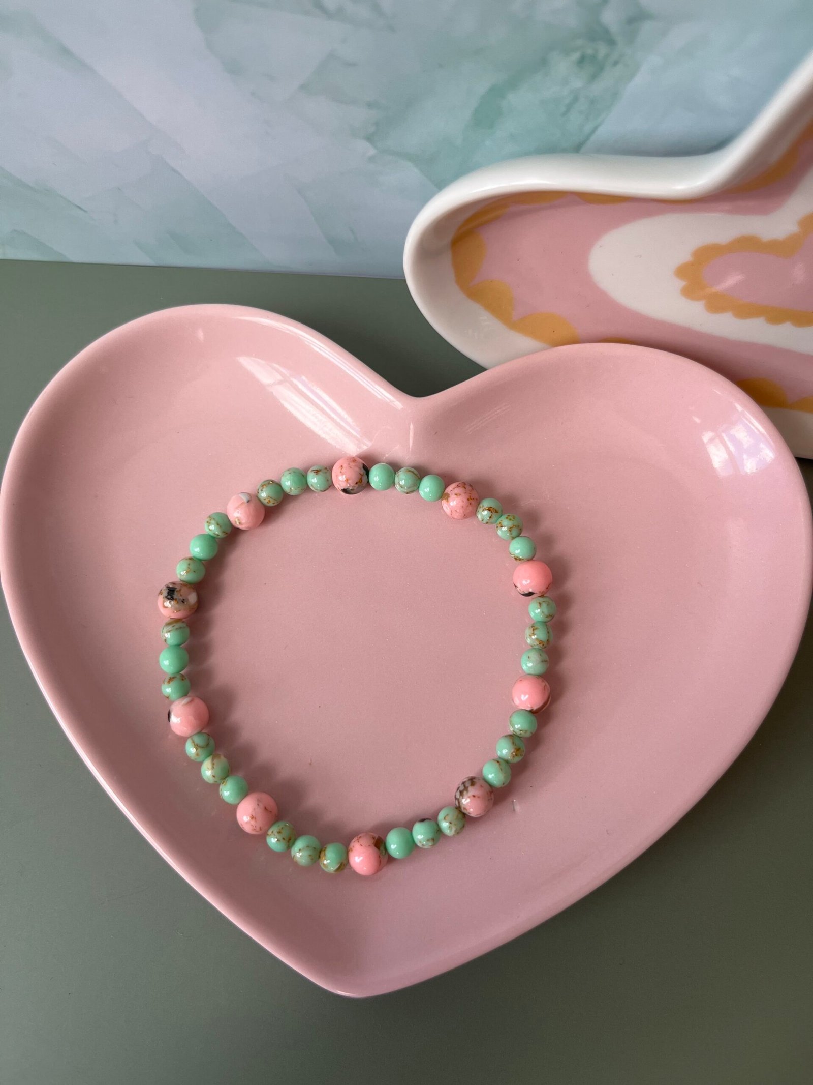 The Kristy Bracelet is a stunning piece of handmade jewellery that combines artistry, elegance, and charm. Featuring contrasting 4mm Lake Blue Shell Howlite and 6mm Pink Shell Howlite stones, this bracelet stands out with its unique dual-tone colour palette. Each bead has been meticulously selected and crafted to create a harmonious blend of textures and colours, adding the perfect accent to your everyday outfit or special occasion attire.