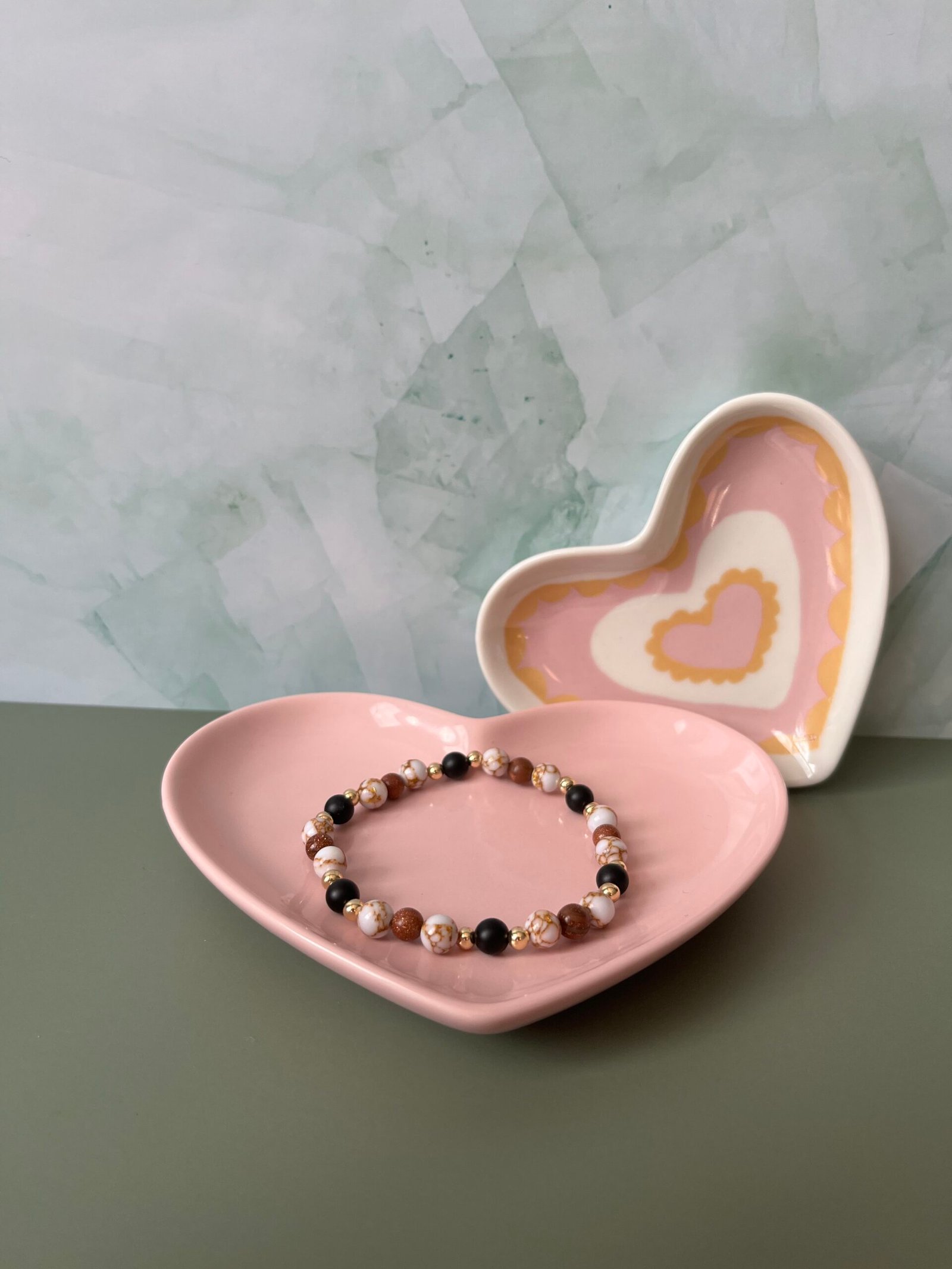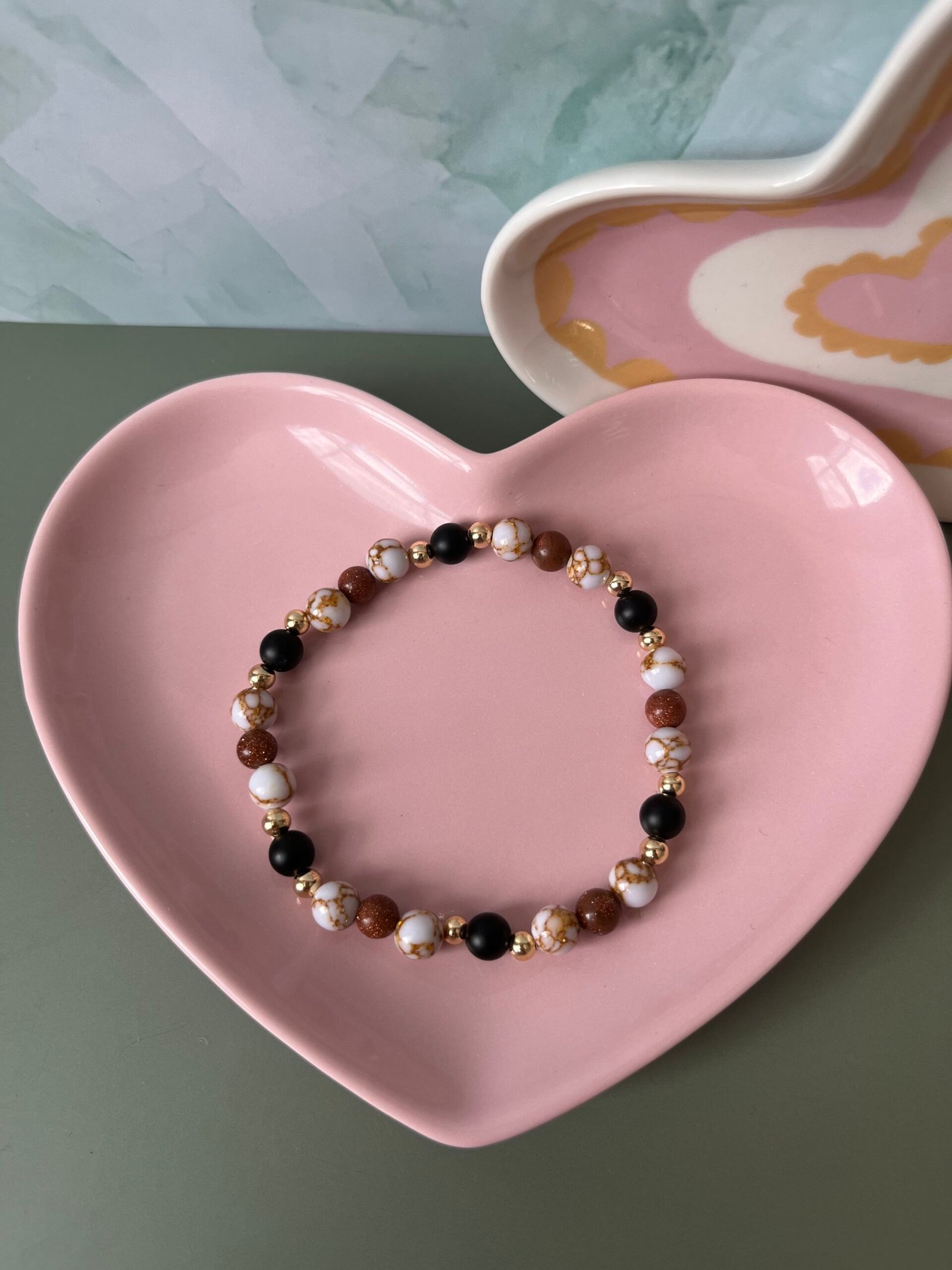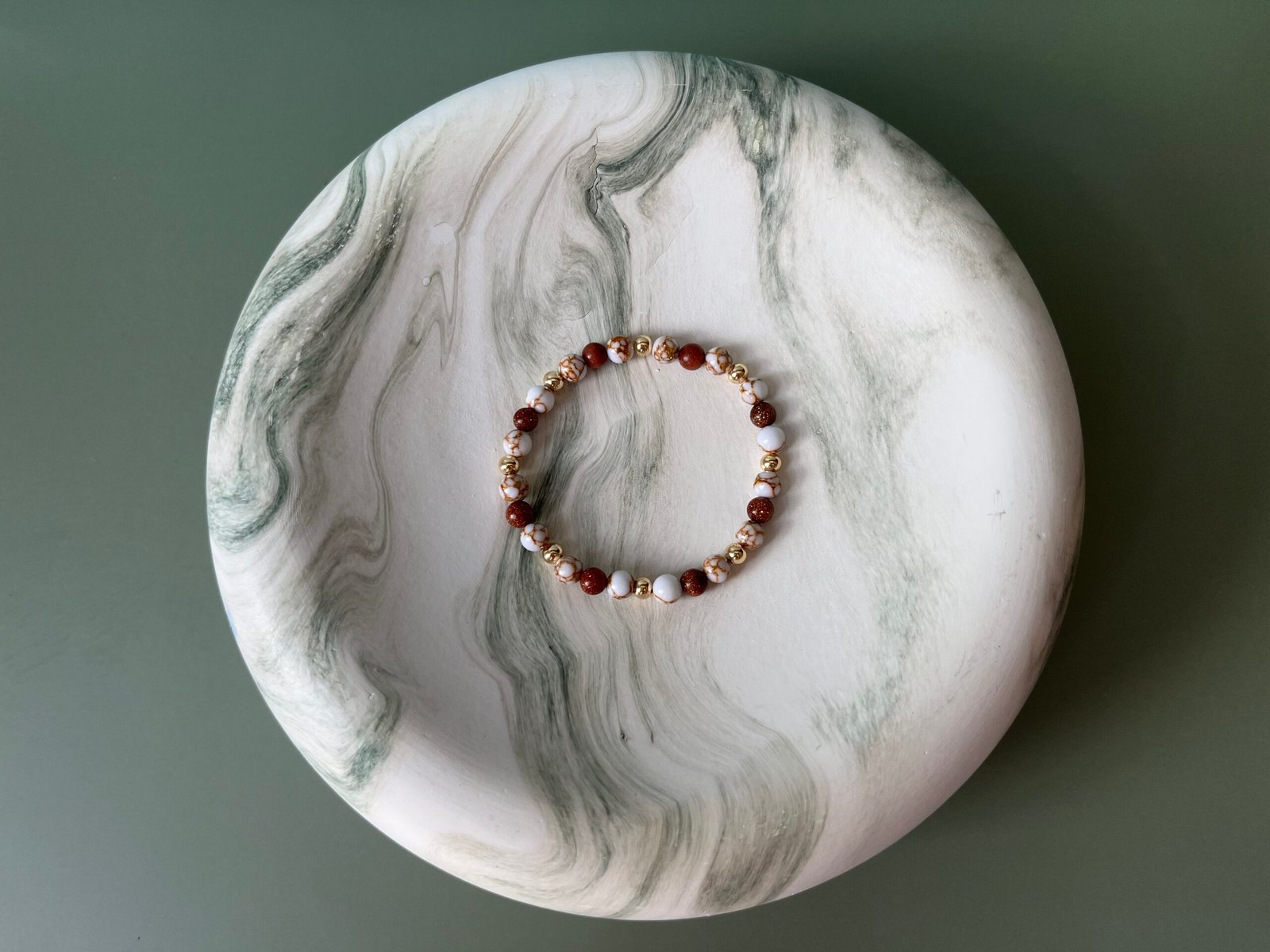 The Sarah Bracelet exemplifies refined elegance, crafted with exquisite materials for a look that blends sophistication with versatility. Handmade with care, this bracelet features radiant White Spun Gold Howlite, shimmering Golden Sandstone, and tarnish-resistant gold accents. Every detail has been thoughtfully designed to ensure both durability and timeless appeal, making The Sarah Bracelet a perfect accessory for any occasion.